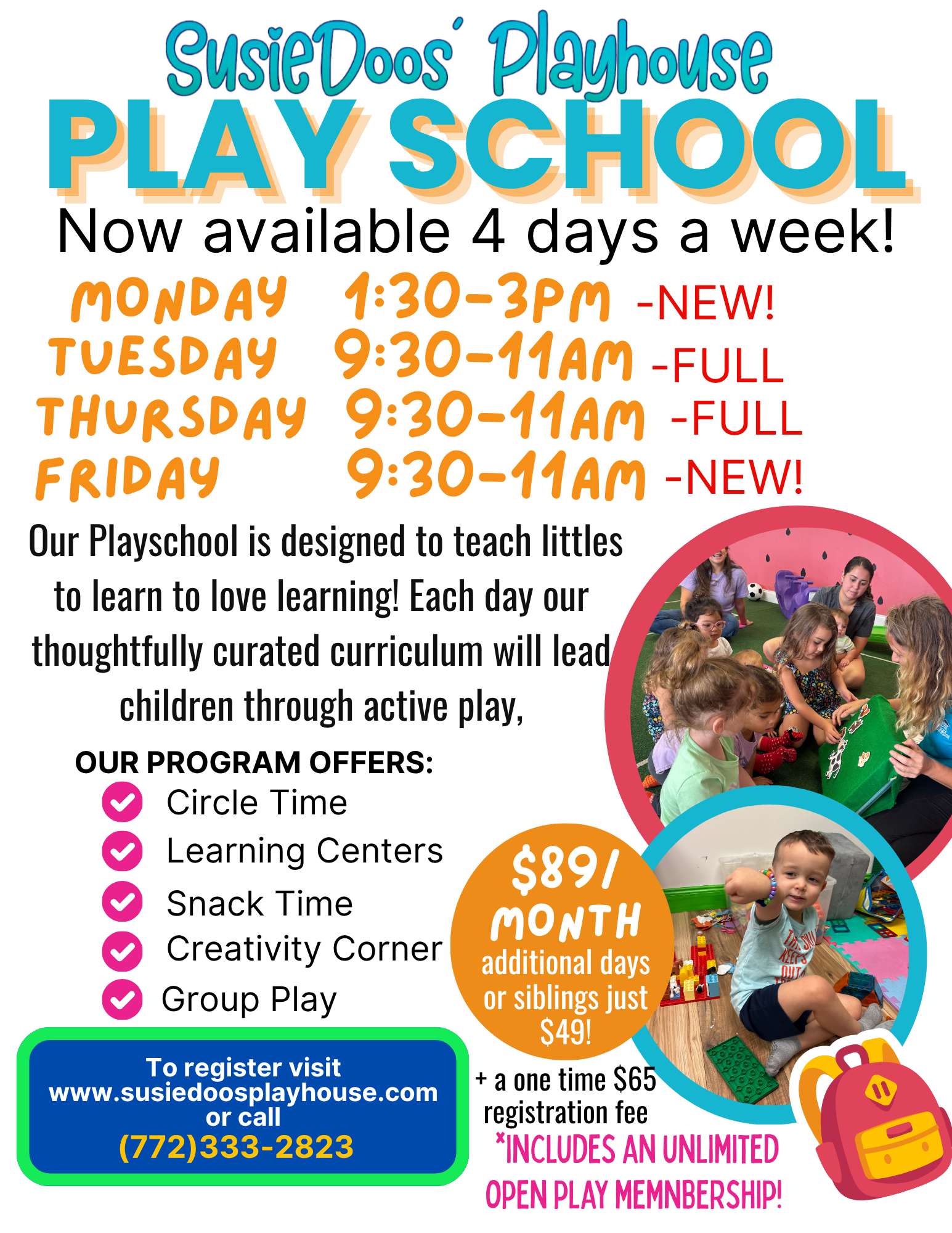 With many years of experience in the both the child development AND the children’s party planning and entertainment industries, SusieDoos Playhouse is more than just an indoor playground. Our staff is not just here to supervise, we engage your littles in fun and learning too!