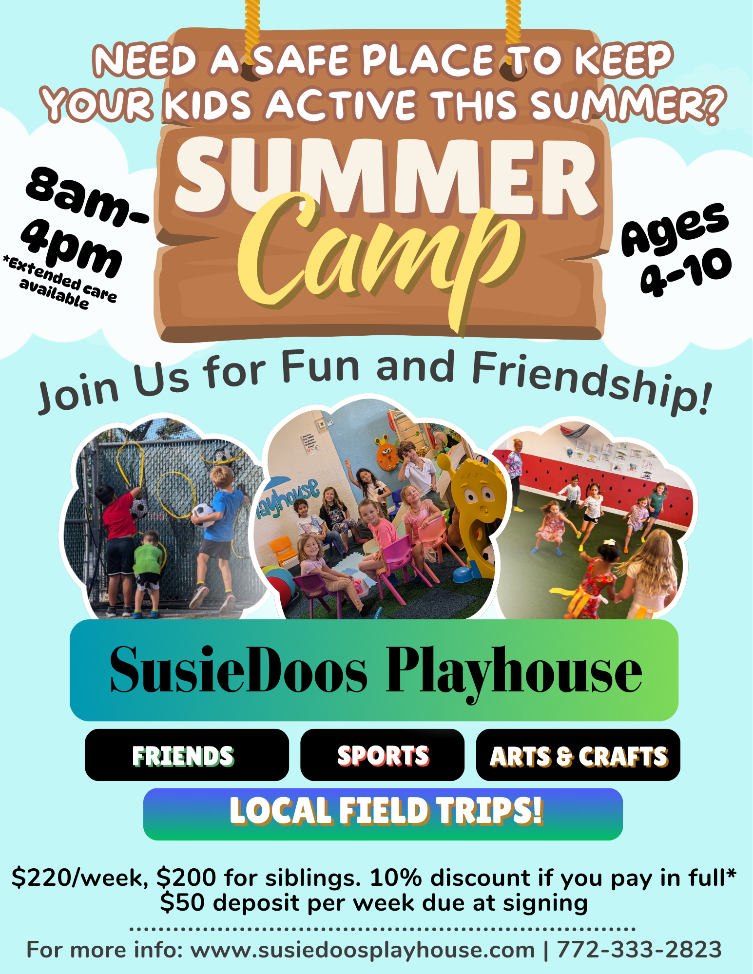 SusieDoos Playhouse Camp is all about Friendship! Our smaller camp size allows for our campers to become a little family of best friends. We have a zero-tolerance bullying policy and foster teamwork in all our activities.