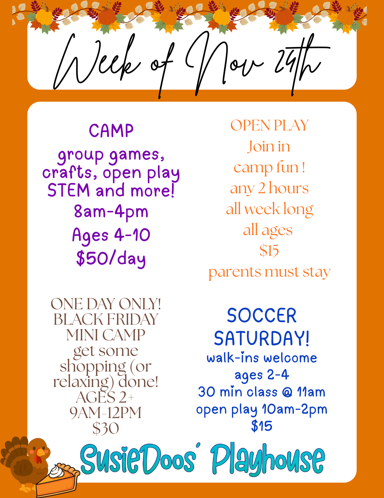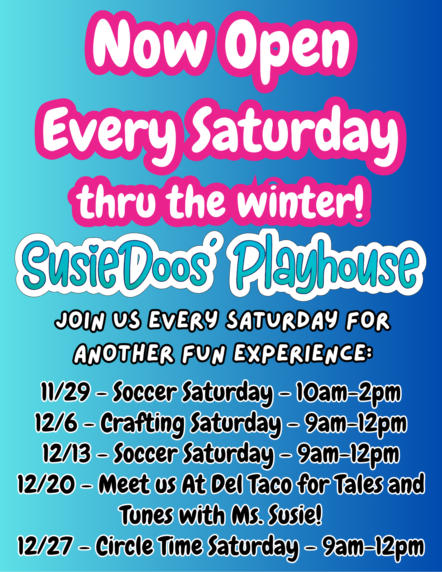 Every moment at SusieDoos is a chance for your child to grow, create, and make memories that will last a lifetime. We believe in providing a space where kids can be themselves, try new things, and simply be happy. Our team is here to make sure every visit is full of joy, laughter, and plenty of playtime.